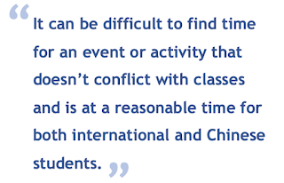 It can be difficult to find time for an event or activity that doesn’t conflict with classes and is at a reasonable time for both international and Chinese students. This problem is compounded by different time zones. I am currently living in Mountain Standard Time in the US, which is 2 hours earlier than EST and 15 hours later than China time, meaning my classes are earlier than expected. This is good for my evening classes (China morning classes), but a bit painful for my morning (Chinese evening) classes. This time difference is made more intense for students living on the Pacific coast—where the latest morning class occurs at 6 am. European classmates also face similar time-zone woes. This means that choosing a time for an activity that works for all students in all time zones is an incredibly difficult challenge—usually, someone will miss out.
