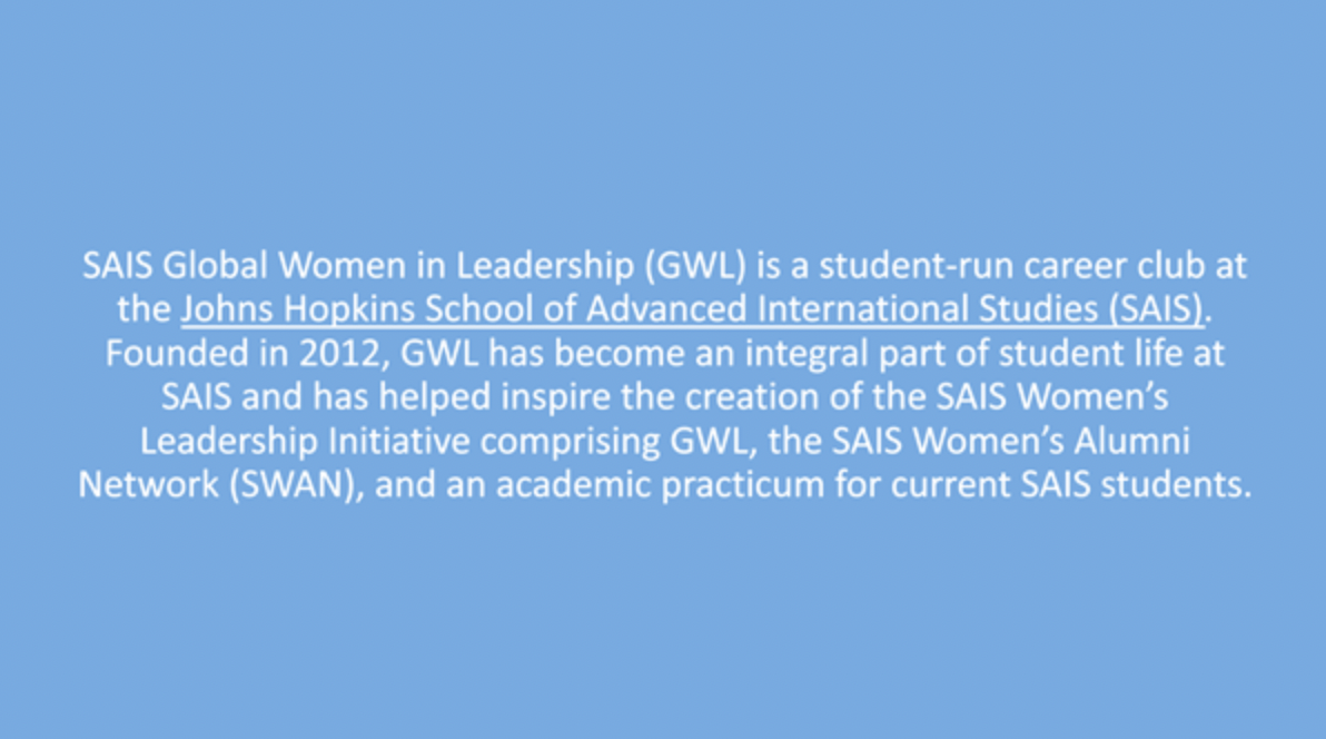 is club came about when I attended the in-person introductory meeting for the Washington, DC Chapter of the Global Women in Leadership (GWL) Club. Immediately after I heard there is a member of the DC GWL executive board dedicated as the liaison between the DC GWL, the Bologna GWL Chapter, and the HNC, I knew that I had to get an HNC Chapter in motion. Currently, there is a huge push both academically and socially to connect all three SAIS campuses, an initiative I am appreciative of and happy to play my part in.The mission of the GWL is to uplift and support women both personally and professionally. The beautiful thing about the HNC GWL is that we are a unique community of women who want to do work in this Sino-Global field, which means that we have unique and specific Sino-Global challenges to face—whether it be crossing cultural lines, forming cross-cultural bonds, interacting with international professors and classmates, starting a career internationally, or adapting to a new country. Basically, we are challenged with navigating the international space as a woman, where we might encounter cultural, social, and professional norms different from what we are used to in our home countries.